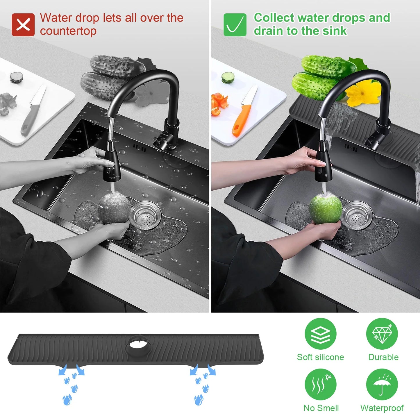 - Say goodbye to puddles around the faucet! This super absorbent rubber drying pad is designed to catch every splash, keeping your surfaces dry.