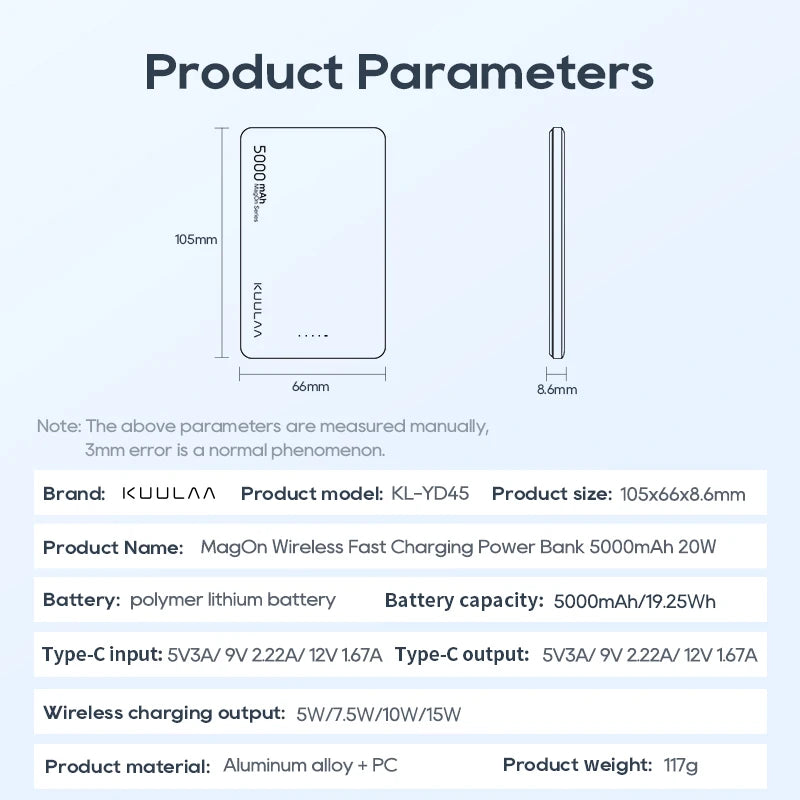- Wireless Charge Output: Choose from 15W, 10W, 7.5W, or 5W options to match your device’s needs.