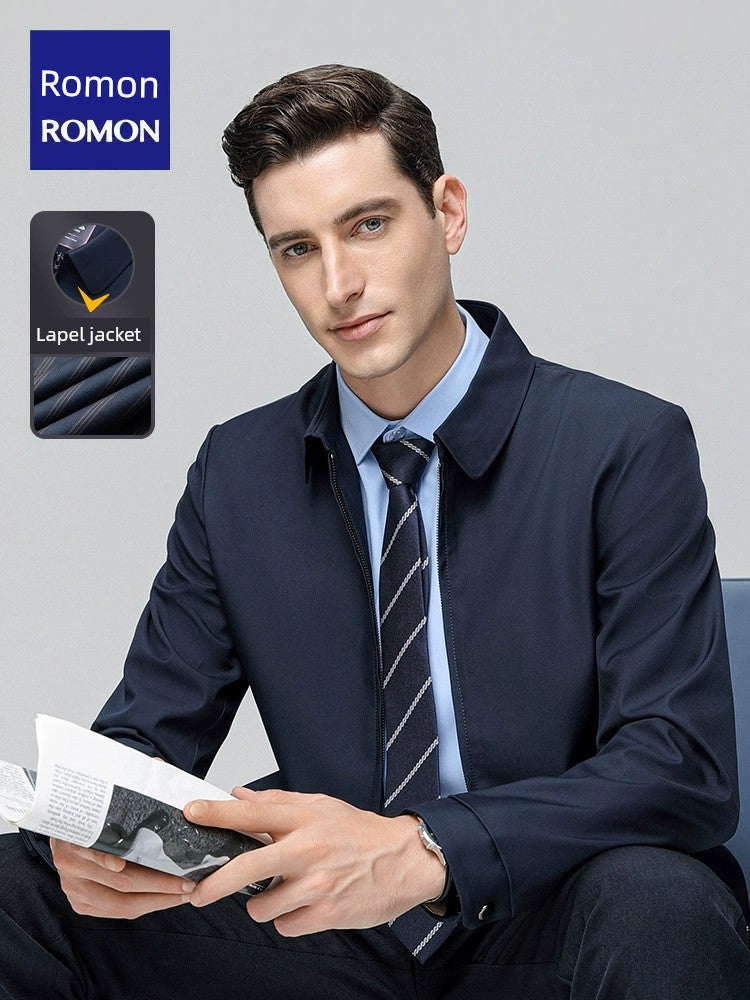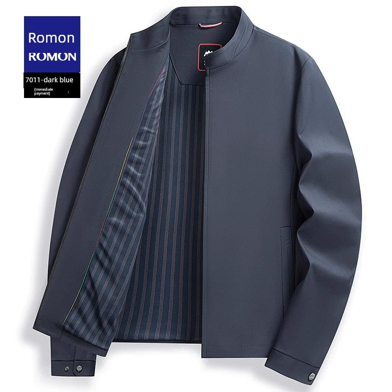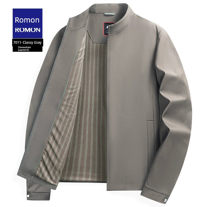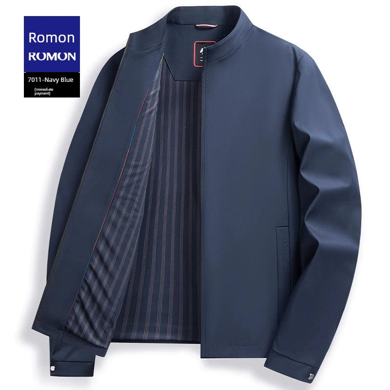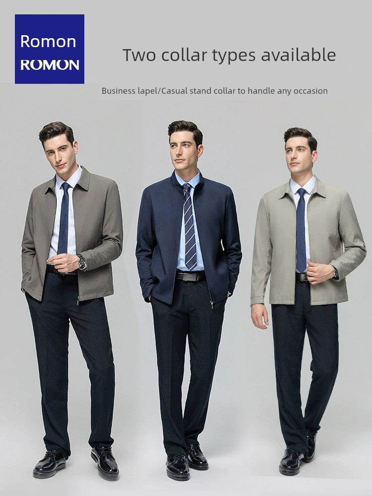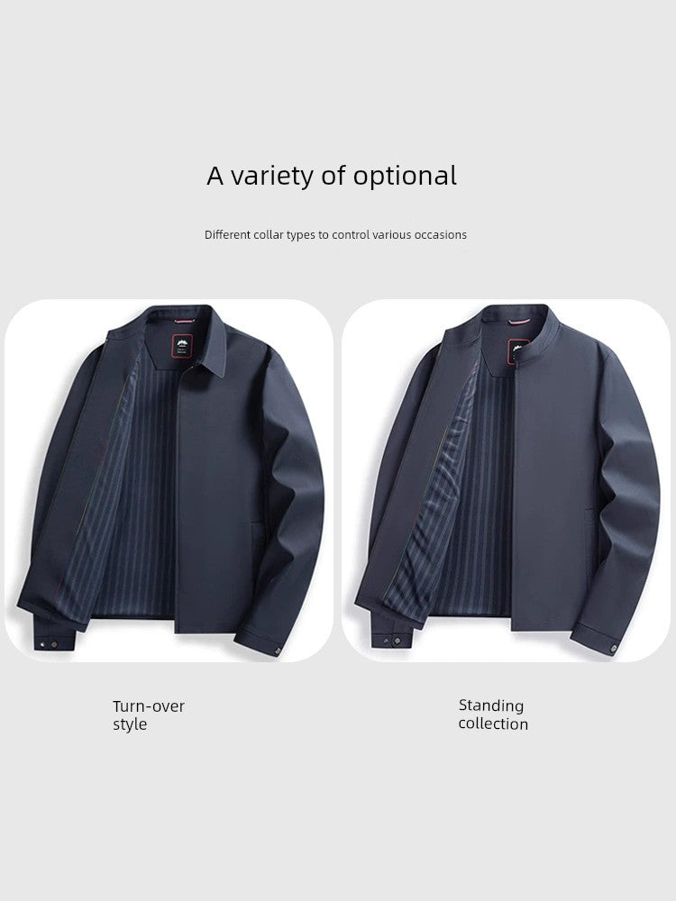 Step into spring with the Executive Stand Collar Jacket—a sophisticated blend of business and leisure, perfect for the modern dad. This jacket combines a classic aesthetic with contemporary style elements, making it a versatile addition to any wardrobe.