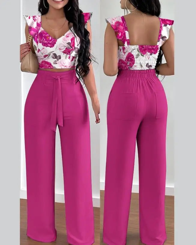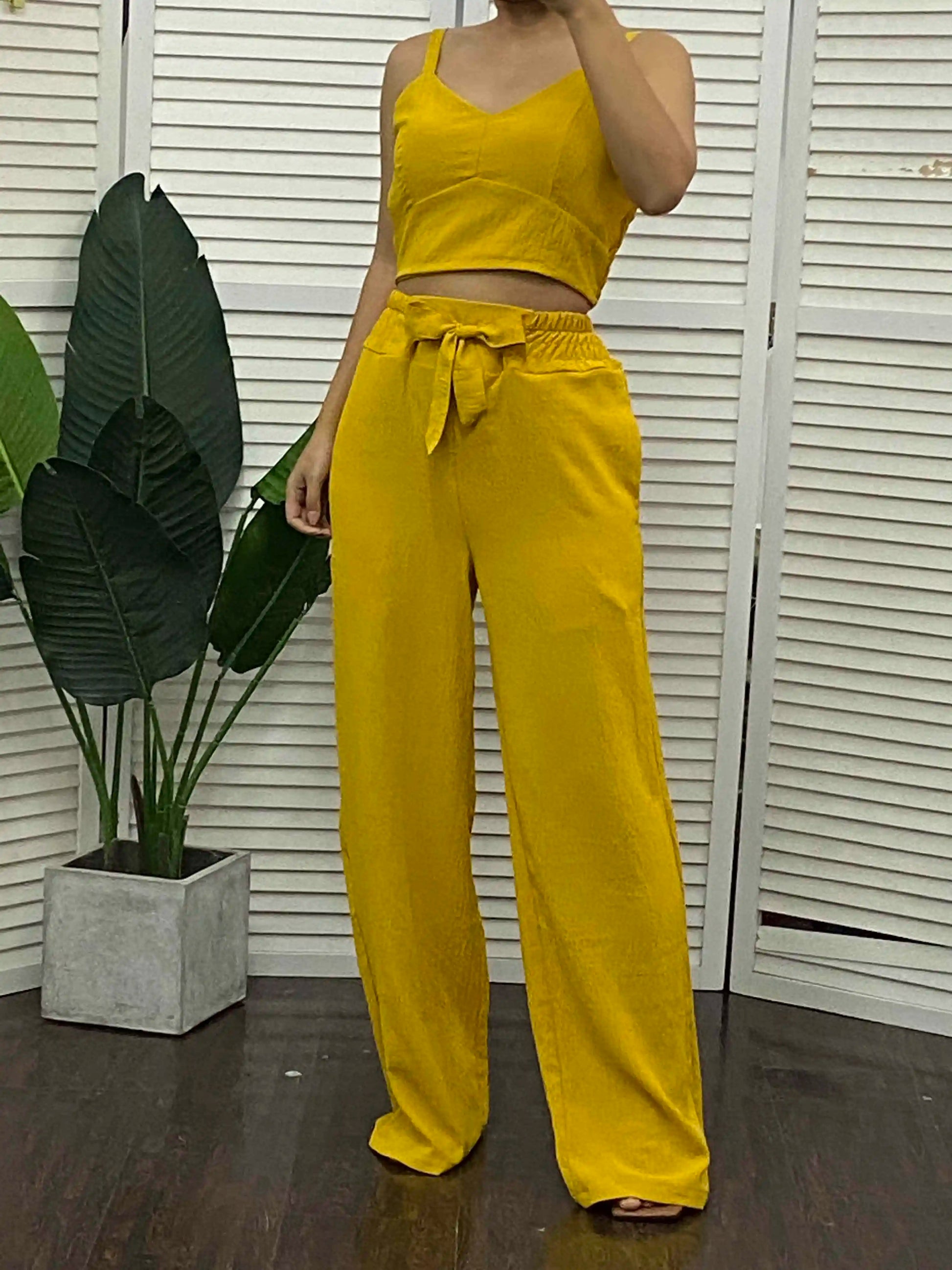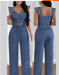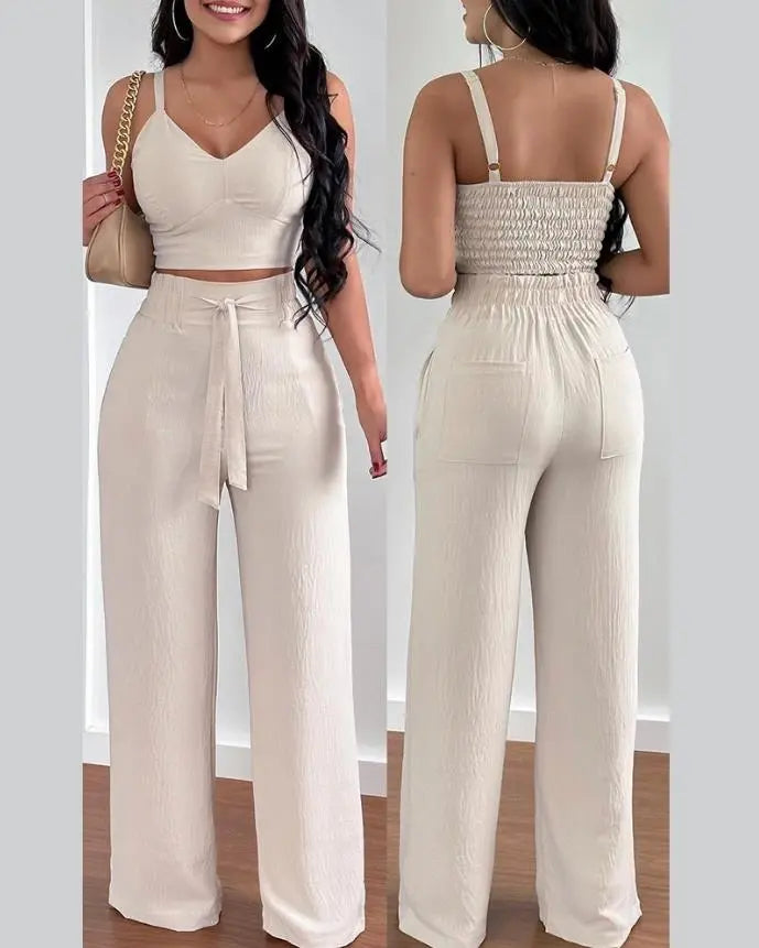 Step up your wardrobe with the perfect blend of sophistication and comfort. CHAXIAOA’s V-neck sleeveless shirred crop top and wide-leg pants set is a must-have for the modern, fashion-forward woman.